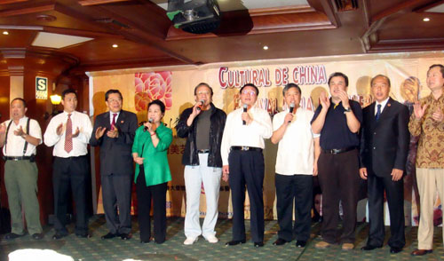 而為了感謝這份來自祖國的慰問,表達對藝術家們的歡迎,當地的民間團體“愛華文藝社”的成員們,也奉獻出了自己最拿手的節目。他們一個個精心打扮、盛裝出場,認真的態度一點都不含糊。只見中華通惠總局主席蕭孝權換上了軍裝、戴上了假胡子,扮起了《沙家浜》中的吳司令;就連中國駐秘魯大使趙五一也和僑胞們打成了一片,頭上扎了白毛巾,扮起陜北的老農民,唱起了《游擊隊之歌》,他們精彩的節目贏得了所有觀眾的笑聲與掌聲,令晚會一次次高潮迭起。