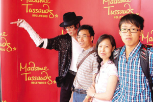 來自深圳的商人陳小興、周娥夫婦是帶著兒子陳曉灝來美看學(xué)校的。陳小興說,從幼年起,麥克爾·杰克遜就是自己的偶像,今天在美旅游途中能看到他的蠟像很幸運。天津漢沽一中的高中生王冠一是同父母及外婆來美旅游的,他表示,很新歡麥克爾·杰克遜。從北京來美旅游的袁宗陽、朱瑞龍夫婦,看到麥克爾·杰克遜的蠟像興奮不已,竟然兩次排隊與蠟像合影。