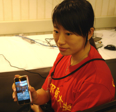 來自卡爾頓大學的中國留學生姜瑛,在新聞中心與同伴分享用手機拍攝的會見胡錦濤場景。(加拿大《世界日報》/翁曉青攝)