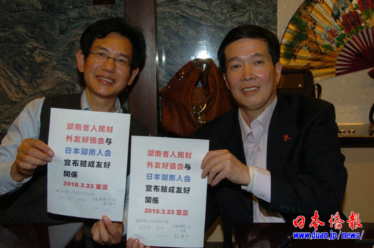 中新網3月24日電 據《日本僑報》報道,3月23日下午,正在日本訪問的湖南省人民對外友好協會專職副會長龐力平一行5人,來到位于東京池袋的湖南會館,和日本湖南人會會長副會長秘書長及部分理事等進行了座談,雙方就推進日本與湖南的交流等達成多項共識,并宣布湖南省人民對外友好協會與日本湖南人會結為友好關系。