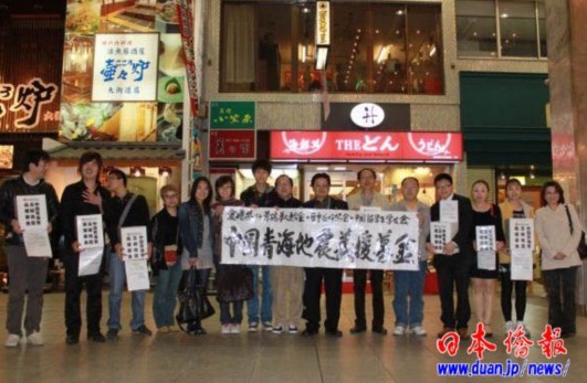 災情就是命令!災難無情,人間有愛!4月22日(星期四),愛媛松山一大早下起了多年未見的瓢潑大雨,但愛媛縣的同胞和日本友人仍然按照約定的時間,冒著大雨毅然走上街頭,開始了由聯合會帶頭部署倡導的聲勢浩大的街頭募捐活動。由三十多人組成的募捐隊伍,彼此不分中國人還是日本人,用真心與熱情共同譜寫、詮釋人間大愛——心向玉樹,情系災區!四幅由聯合會副會長、旅日山水畫家牛子華即時揮毫寫就的《愛媛縣華僑華人聯合會 中國留學生學友會 日中友好協會:為中國青海地震義援募金》的巨大橫幅在指定地點拉開了,募捐隊伍懷抱著十多個由聯合會事務局準備的專用募捐箱,拉開了活動的序幕。“拜托為中國青海地震災區獻愛心”的募捐聲,聲聲入耳。向來對救災特別熱情的日本國民開始駐足慷慨解囊……和兩年前祖國汶川大地震賑災募捐情景同樣感人的一幕再次在同一地點重新演繹。我們禁不住熱淚盈眶——祈福災區人民!衷心感謝熱情、善良、友好的人們!第一天共募集到58,700日元。