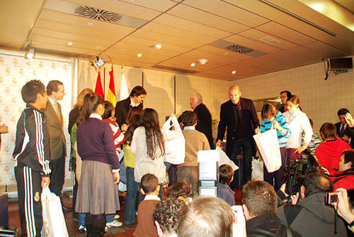中新網(wǎng)12月26日電 據(jù)西班牙《歐華報(bào)》報(bào)道,由皇馬基金會(huì)發(fā)起“每個(gè)孩子都有玩具”的活動(dòng),日前在馬德里伯納烏球場(chǎng)內(nèi)舉行。皇馬現(xiàn)役超級(jí)球星卡卡,及退役球星齊達(dá)內(nèi)到場(chǎng)給馬德里兒童代表送出“第一份”圣誕節(jié)禮物。毛尚雅等4名華裔小朋友作為馬德里華僑子女代表,參觀了皇馬博物館、伯納烏球場(chǎng)及球員休息室等地,并在活動(dòng)中上臺(tái)領(lǐng)取禮物,接受電視臺(tái)采訪。