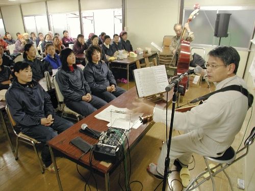 “日中之歌交流會”舉辦當天,井村行夫演奏吉他用中文為中國研修生唱出了《大海啊,故鄉》,一些思念故鄉的中國研修生當場流下了熱淚。隨后,中國研修生們集體用日語唱出了《四季歌》,把這次的交流推向高潮。(仇棣)