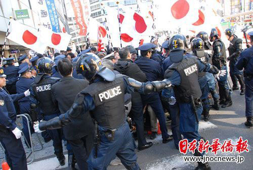 面對右翼分子的叫囂,“陽光城”的華人員工顯得非常沉著冷靜,依然熱情接待來到這里的每一位客人。在現場,日本警方也積極維護華人不受傷害。右翼分子在講演中攻擊中國留學生,一位中國女留學生勇敢地站出來,大聲說:“我是中國人,是中國留學生,你們都是‘右翼垃圾’!”當右翼分子要對這名女學生動手時,警員立即沖過來加以保護。