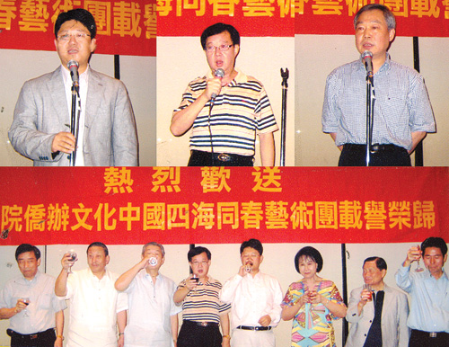 中國駐菲大使館白天代辦,王軍領(lǐng)事等使館領(lǐng)導(dǎo),藝術(shù)團團長熊昌良,藝術(shù)團全體演員和菲華各界聯(lián)合會名譽主席,常務(wù)委員、委員等出席了歡送宴會。中國駐菲大使館白天政務(wù)參贊、藝術(shù)團團長熊昌良,菲華各界聯(lián)合會主席戴宏達先后致詞。該會委員們與藝術(shù)家們歡聚一堂,大家觸光交錯,氣氛熱烈。