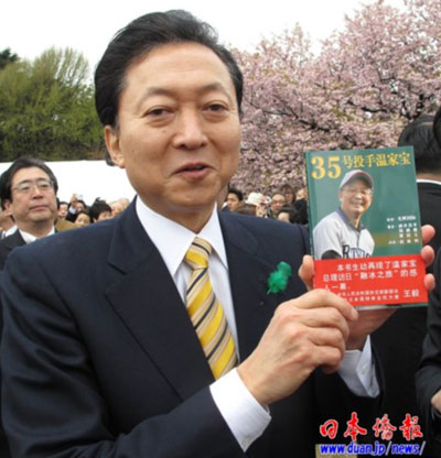 在“賞櫻會”上,受邀參加的日本僑報社張景子社長向鳩山首相贈送了該社出版的《35號投手溫家寶》,鳩山首相欣然收下,并勉勵日本僑報社繼續為日中交流做貢獻。張景子說,“我們來自中國,在日本創辦的日本僑報出版社致力于日中交流,已經出版了200來本書。2008年出版了中日文版《35號投手溫家寶》,今天特地給您帶來了一本!兵F山首相高興地從張景子手中接過《35號投手溫家寶》一書,仔細端詳,并說:“我下個月就要與溫家寶總理會面。希望你們繼續努力,為促進日中交流作出更大的貢獻!闭f完,鳩山首相高高地舉起《35號投手溫家寶》一書,讓大家拍照。