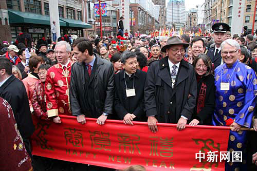 隨著震天的鑼鼓聲、鞭炮聲、大人小孩歡樂的笑聲,“財(cái)神爺”身著大紅袍,頭戴金盔,手舉護(hù)身旗走在游行隊(duì)伍最前面。在南腔北調(diào)的“恭喜發(fā)財(cái)”聲中,新上任不久的卑詩省省督波因特沿途向民眾大派“利是”;加拿大最大反對黨聯(lián)邦自由黨黨領(lǐng)狄安身穿紅色唐裝,頻頻拱手賀禧;中國駐溫哥華總領(lǐng)事楊強(qiáng),卑詩省省長金寶爾和溫哥華市長蘇利文等加國三級政要并排而行,拉著寫滿新春祝福的橫幅,與民眾共慶戊子鼠年新春。