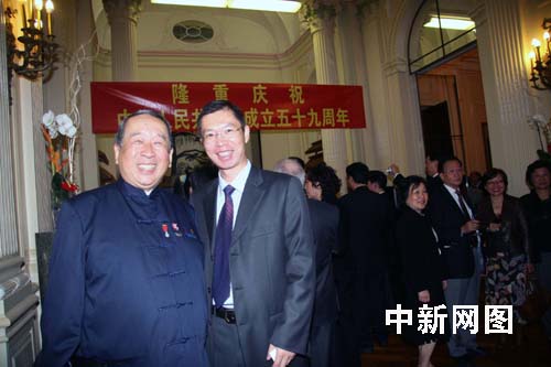 是晚的中國駐法使館內張燈結彩,一派喜氣;走廊里布置的北京國家體育場——鳥巢掩映在璀璨的禮花中,分外奪目;旅法華人社團向祖(籍)國祝賀生日的花籃從使館大門口排到了二樓。身著中式禮服的中國駐法大使與僑胞們同賀祖(籍)國59華誕。