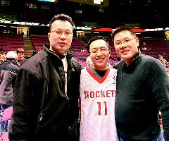 姚明迷黃建金(中)穿上火箭隊11號球衣,與好友陳家豪(左)及馮景明一起為姚明加油。(美國《世界日報》/劉美玲攝)