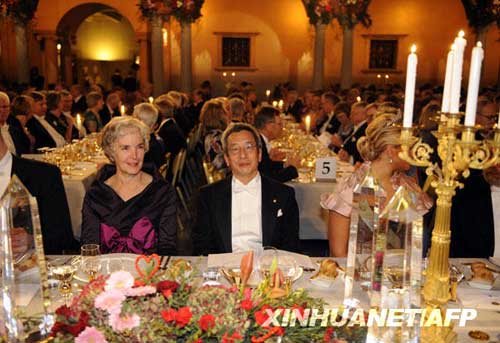 美籍華裔科學家錢永健(中)在瑞典斯德哥爾摩領取諾貝爾化學獎后參加盛大晚宴。(新華社/法新)
