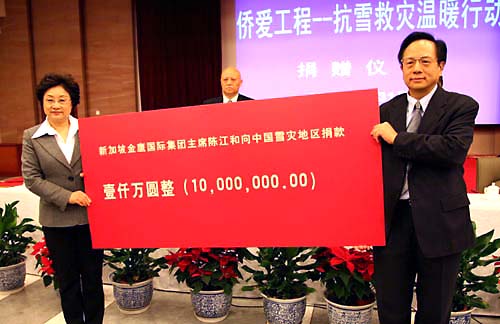 中新網1月31日電 1月31日下午,國務院僑辦在京舉行“僑愛工程-抗雪救災 溫暖行動”捐贈儀式,中國僑商投資企業協會常務副會長、新加坡金鷹國際集團主席陳江和向中國雨雪冰凍災區捐款1000萬元人民幣。
