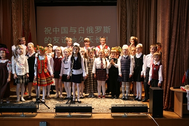 在學校禮堂,已經精心準備了一臺以“新中國成立60周年”為主題的文藝節目。在“中白友誼萬古長青”的屏幕背景下,孩子們用稚嫩的童音朗讀了唐詩《詠鵝》和《靜夜思》,用質樸的歌聲演唱了兒歌《兩只老虎》,表演了專門從中國電影里學來的民間舞蹈,并邀請中國阿姨上臺共唱《歌聲與微笑》!罢埌盐业母鑳簬Щ啬愕募,請把你的微笑留下!边@充滿感情的歌聲把歡樂的氣氛推向高潮。