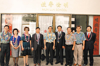 中國國僑辦講師團參觀檀香山明倫中文學校,并與董事長方惠思(左三)及校長黃卓游(左五)在校門口合影。(高振華 攝)
