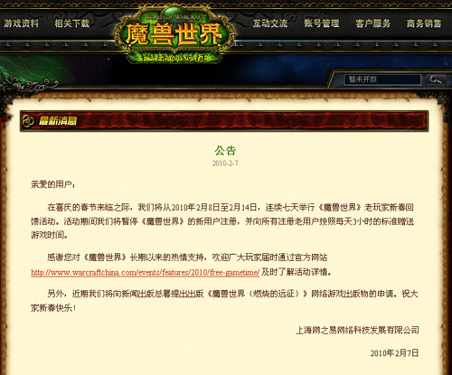 網易昨天是在一篇魔獸世界游戲內活動的公告中披露上述消息的。公告稱將從2010年2月8日至2月14日,連續七天舉行《魔獸世界》老玩家新春回饋活動。活動期間將暫停《魔獸世界》的新用戶注冊,并向所有注冊老用戶按照每天3小時的標準贈送游戲時間。