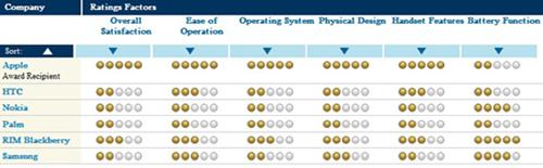 最終,iPhone的整體滿意度為滿分5分。相比之下,RIM整體滿意度為3分,而諾基亞、三星、Palm和宏達電的整體滿意度只有2分。