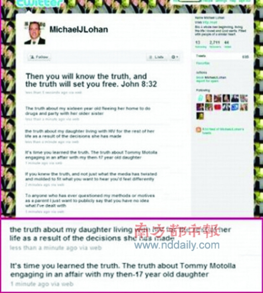 27日,林賽·羅韓的父親邁克爾·羅韓在Twitter稱女兒染上艾滋病,還說她17歲時曾與瑪莉亞·凱利的前夫Tom myMottola有染。邁克爾說,林賽現在的行徑如此荒唐,完全是因為得了艾滋病,因此她決定就這樣渾渾噩噩過一生!但很快邁克爾卻突然將消息撤下,聲稱自己的Twitter網頁被黑客入侵,網頁上所言都不是事實。事后有網友調查,發覺他的網頁沒有被入侵,證實他在說謊。