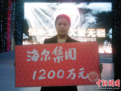 中新網(wǎng)4月21日電 4月20日,由中宣部、國家廣電總局、民政部、中國紅十字會(huì)主辦,中央電視臺(tái)承辦的《情系玉樹 大愛無疆--抗震救災(zāi)大型募捐活動(dòng)特別節(jié)目》在中央電視臺(tái)現(xiàn)場(chǎng)直播。海爾集團(tuán)在現(xiàn)場(chǎng)向?yàn)?zāi)區(qū)捐款1200萬元,全力支持災(zāi)區(qū)緊急救災(zāi)和災(zāi)后重建工作。
