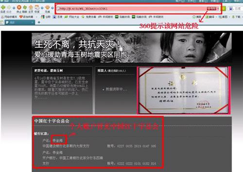 中新網4月24日電 360安全中心今日再度發出釣魚網站安全警示:近期不法分子以玉樹賑災捐款的名義制作了大量釣魚網站,利用網友愛心大肆詐騙。360安全專家石曉虹博士為此提醒廣大網民,在網上用網銀、第三方支付工具等在線方式捐款一定要慎重,并盡量使用360網盾等有效的反釣魚軟件進行自動識別各種釣魚網站。