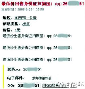 近日,有網友發帖稱,近來在多個分類信息網站上發現一則題為《最低價出售身份證掃描圖》的廣告,稱只需一元錢就能買到一份身份證復印件。