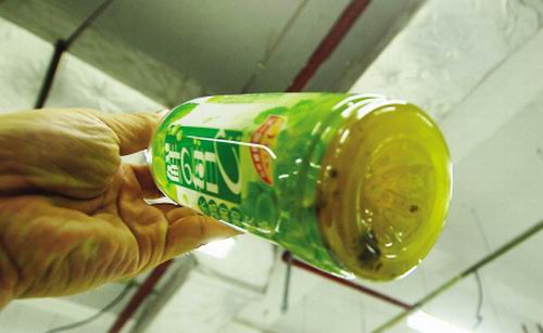 在路邊便利店買了一瓶“康師傅”葡萄汁飲料,仰脖喝下大半瓶后,突然感覺有異物,對(duì)著燈光細(xì)看,竟發(fā)現(xiàn)飲料瓶里沉淀有許多黃色的絮狀物品,還有一坨黑乎乎的沉淀物,這是10月16日晚陳先生在福州道山西路一便利店遭遇的一幕。