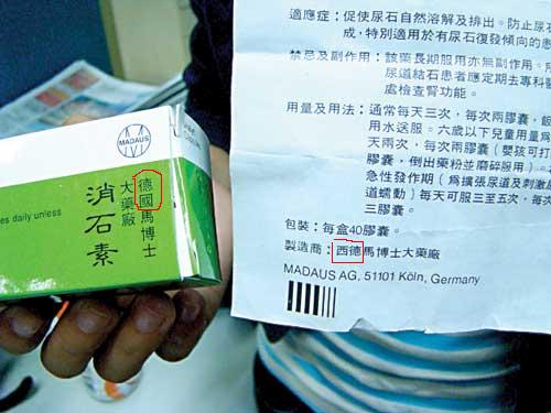 17日上午,記者看到“消石素”的藥盒上寫有“德國馬博士大藥廠”字樣,而說明書上標(biāo)的制造商,卻是“西德馬博士大藥廠”。就是“德國”與“西德”這點(diǎn)差別,讓李先生對藥品的真實(shí)性產(chǎn)生了懷疑。李先生認(rèn)為,東德與西德早就統(tǒng)一,哪里既有德國,又有西德呢?