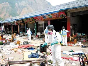 連續(xù)4日,10名來(lái)自廣州市檢驗(yàn)檢疫局的隊(duì)員和來(lái)自湛江、汕頭、深圳的檢驗(yàn)檢疫員一起,在北川縣城內(nèi)執(zhí)行防疫、消毒、殺蟲(chóng)等任務(wù)。前晚他們和最后一批防疫隊(duì)伍從北川縣城撤出,繼續(xù)奔赴其他重災(zāi)區(qū)進(jìn)行防疫工作。剛剛過(guò)去的一個(gè)星期,他們與逝者相伴入眠進(jìn)食,還要面臨3公里之外唐家山堰塞湖的洪水威脅,承受了常人難以想象的巨大心理和工作壓力。
