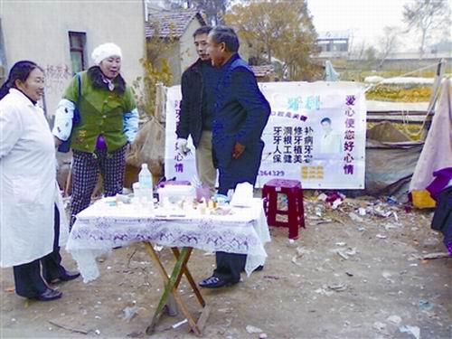 7日,記者現(xiàn)場看到,一個(gè)用白桌布鋪好的小桌上擺著牙具模型、補(bǔ)牙、脫脂棉、酒精等治牙工具,兩個(gè)破舊的牙具模型上黑色污垢清晰可見,所有工具包括酒精均只看到膠布貼的標(biāo)識,旁邊是兩把塑料椅,3只杯子,四五瓶藥和六七把拔鉗。大幅宣傳畫靠在路邊的垃圾堆上,一名老人剛看完牙正遞給“牙醫(yī)”10元錢。