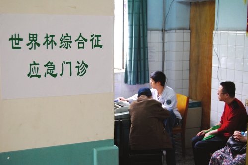 昨日上午,成都市第三人民醫院急診科主任魏鳴將印有“世界杯綜合征應急門診”門牌貼在急診內科門口。從今天開始,這個應急門診將24小時為球迷們服務。9名醫生中除了一名女醫生,其他的人全是球迷。門診沒有安裝電視,對于球迷醫生來說,值班的晚上也是痛苦的煎熬。