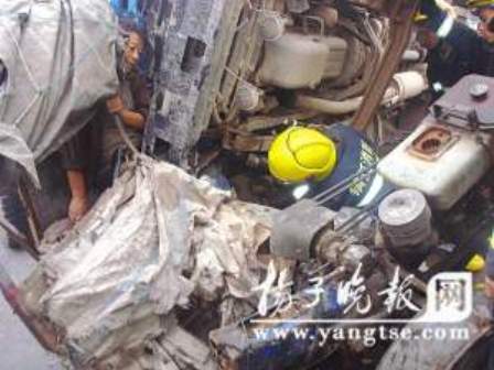 事故發生后,潤州大隊七里甸消防中隊10名官兵奉命趕往現場救援,潤州交巡警迅速趕到現場指揮疏散交通,很快120急救車也趕至現場。10分鐘后,救援官兵到達現場,發現拖拉機簡易駕駛室已嚴重變形,被困司機滿臉血污動彈不得,不住發出痛苦的呻吟聲。救援指揮員查看了現場情況,發現救援關鍵在貨車車頭,只有將壓在拖拉機上的車頭拉開,才能破拆救援,但要將車頭拉離,必須要動用大型吊車,而且需要一定時間。面對不斷呻吟的被困司機,指揮員當即請120急救醫生為其輸液,以減少司機的痛楚。