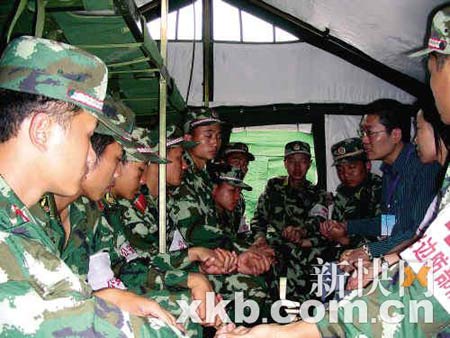 “300名孩子的尸體都堆在學校。我們就在不遠處扎營,晚上夢見死去的孩子們全部站起來了朝我走過來……”戰士小駱流著淚抓住心理救援隊專家的手訴說著。前日,廣州心理救援隊來到了廣東公安邊防總隊某支隊,在帳篷里為115名官兵進行心理輔導!皯鹗總冊诰仍畷r遇到的問題已經超過了他們的承受范圍,他們急需心理輔導!焙蛻鹗總兘涣髦蟮暮髦t生表達了自己的擔憂。