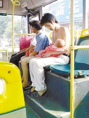 昨天(24日)下午4時(shí)左右,在廣東省東莞36路公交車上,由于車內(nèi)空調(diào)涼爽,患感冒的小女嬰一上車就打起瞌睡,父親阿勇(化名)趕忙脫下襯衣包裹住懷中的女兒。乘客對(duì)赤膊的阿勇贊彈不一,有男乘客認(rèn)為阿勇脫衣裹蓋女兒是父愛的表現(xiàn),無(wú)可厚非;有女乘客則認(rèn)為阿勇在公眾場(chǎng)合打赤膊不雅,影響了東莞的城市文明形象。
