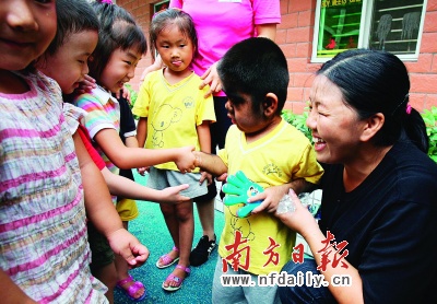 在數(shù)次聯(lián)系幼兒園遭拒后(本報(bào)7月23日曾作報(bào)道),“毛孩”文才昨日終于背上書(shū)包走進(jìn)梧桐山中英文幼兒園,開(kāi)始了他在深圳的“上學(xué)夢(mèng)”。昨日,和同齡小朋友在一起玩,毛孩臉上洋溢著幸福的微笑。而他的雙胞胎弟弟因沒(méi)有受到資助入學(xué)而傷心流淚。“毛人”家族救助工程專家組組長(zhǎng)田亞華表示,醫(yī)院“救命不救窮”,培養(yǎng)毛孩家族的自救意識(shí)對(duì)他們的心理矯正至關(guān)重要。