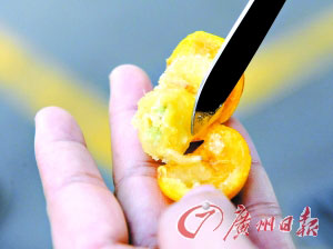 “我吃了近30個(gè)金橘,到最后3個(gè)才發(fā)現(xiàn)里頭有蟲(chóng)!”家住海珠區(qū)石溪的龔先生報(bào)料稱(chēng),他在家附近的水果檔買(mǎi)到有蛆金橘。廣州市農(nóng)業(yè)局昨日(28日)實(shí)地調(diào)查,發(fā)現(xiàn)這些有蛆金橘的貨源來(lái)自廣州江南果蔬批發(fā)市場(chǎng),產(chǎn)地則是外省。