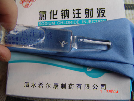 平頂山市新華區(qū)人民醫(yī)院秦大夫向記者介紹說,2008年11月5日,他正在給患者進(jìn)行特殊治療時(shí),發(fā)現(xiàn)注射用的0.9%氯化鈉注射液內(nèi)有較大異物且肉眼可見,形狀約像一只蚊子(如圖),該藥品批號(hào)為0807165,生產(chǎn)廠家是山東省泗水希爾康制藥有限公司。