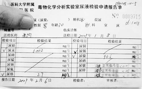 2009年1月8日,在取下兩顆鎳鉻烤瓷牙整整1個月后,劉原再次到朝陽醫院做尿鎳檢測,結果鎳含量變成了93.6個單位——比前一次檢測下降了將近20個單位。在北大醫院做的腎常規檢查結果也出來了,去掉鎳鉻烤瓷牙后,反應敏感度的指數下降了200多個單位,24小時尿蛋白定量也下降了一倍。
