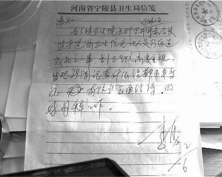 “寧陵縣邏崗鎮衛生院沒有行醫資格的醫生給我兒媳接生,導致胎死腹中。”6月1日,商丘市民權縣伯黨鄉村民郭漢章打來熱線反映。而記者在采訪中,卻意外地發現一份該縣衛生局長簽名的通知,要求:“各鄉衛生院高度重視,發現新聞記者,什么話都不要多說……”(如左圖)據郭漢章介紹,5月1日傍晚,兒媳趙婭君感到腹部陣痛,家人立即將其送入寧陵縣邏崗鎮衛生院檢查。“當晚做B超檢查時,醫生說胎音、羊水一切正常。第二天早上6點,醫生王美英叫來一個人,一起將兒媳送進產房后,兩個人不停地在兒媳腹部擠壓,一個半小時后,趙婭君全身顫抖,面色異常。做了檢查后,證實其腹中胎兒已經死亡。”