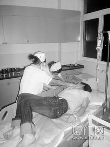 醫生正忙著為中毒患者洗胃