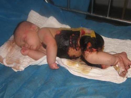 昨日(12月30日),記者在187醫院燒傷科307房看到,男嬰黃堂國躺在床上,前胸、右腿和臀部等被嚴重燙傷,燙傷處被涂上了厚厚的藥膏。黃堂國的父母在病床前不停嘆息,“因借不到錢,現在醫院已經停止對孩子用藥了!秉S堂國的母親告訴記者,她家住?谑旋埲A區遵譚鎮群力村委會美萬村。12月19日晚,她正準備給孩子洗澡,當時先往盆里放熱水,正想放冷水時忽然想起忘了給孩子拿衣服,就在她出去拿衣服時,孩子不慎掉進了熱水盆,“當時孩子被燙得哇哇直哭”。