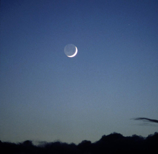 月球位于日、地之間時稱之為“朔”,月球暗的半個球朝向地球,我們看不到它;朔之后的一、二天,鐮刀狀的新月從西方的天空中出現,當月球呈鐮刀狀出現在天邊的時候,我們能看到月球圓面的其余部分顯現微弱的光輝。這種光輝來自地球反射的太陽光,稱為“灰光”。地球能把入射陽光的40%反射出去,比月球反射光線的“能力”高得多,從而可以照亮月球,產生“灰光”。