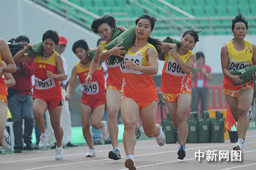 中新網(wǎng)泉州10月30日電 (劉通)在今天上午舉行的第六屆全國(guó)農(nóng)民運(yùn)動(dòng)會(huì)上,女子五人抗洪搬沙包賽跑進(jìn)行了第一輪預(yù)賽。圖為參賽選手們肩扛沙袋在賽道上飛奔。