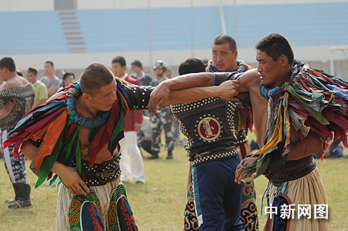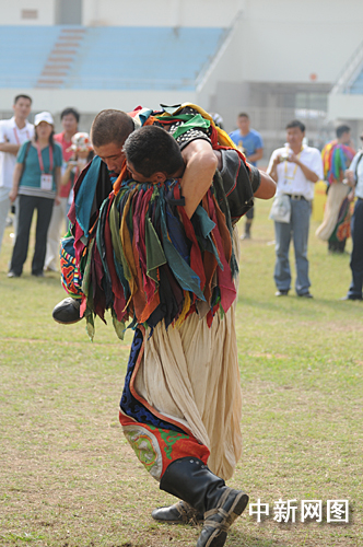 中新網(wǎng)泉州10月31日電 (劉通)今天上午,第六屆全國農(nóng)民運(yùn)動會在福建泉州繼續(xù)進(jìn)行!安恕(蒙古族摔跤)雖是本屆農(nóng)運(yùn)會中國式摔跤比賽中的一個小項,但卻極富觀賞性和趣味性。無論服飾、入場儀式還是比賽規(guī)則都帶有獨(dú)特鮮明的民族色彩。