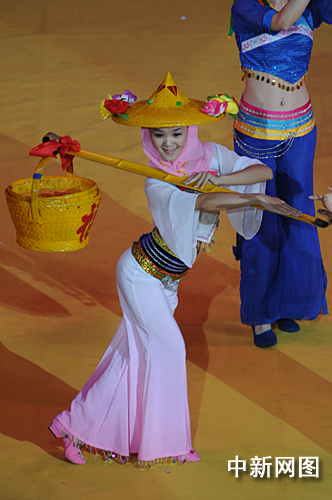 圖為福建“惠安女”挑著竹籃表演趕送節,以舞蹈表達心中的喜悅之情。