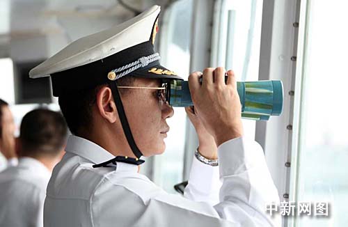 圖為“海口”號(hào)導(dǎo)彈驅(qū)逐艦政委劉健忠在觀察前方海域海況。中新社記者 孫自法 攝