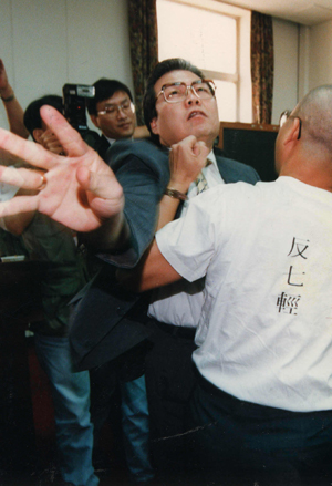 當朱高正跳上主席臺,議場內(nèi)頓時像爆發(fā)的活火山,趙少康等人沖上發(fā)言臺,抓住高站在主席臺上的朱高正的腳踝。后排的“立委”則大喊“上啊!”“打死他,打死他!”,個個爭先恐后沖向主席臺。