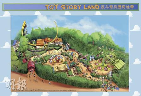 以電影《反斗奇兵3》為骨干,在區內擺放各式超巨型玩具,旅客置身其中,如變了小矮人。區內有3個機動游戲:其一是賓客坐上如“臘腸狗”的設施,經歷一段顛簸旅程;另一設施是一臺穿梭飛車,接載賓客沿高達數十呎的U形軌道快速來回;最后是一個“跳傘”訓練旅程,賓客可因應喜好,調校從25米高臺向下急墜的速度。