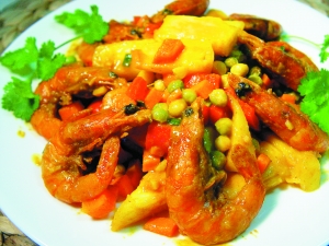 咖喱菠蘿蝦是一道泰式風情料理,是選用新鮮菠蘿肉和大蝦,與泰國黃咖哩和清水一同烹煮,加入椰漿調味即成。迪雅稱,大蝦炸后不僅酥脆彈牙,還飽吸了香濃的咖哩汁,吃完后用清甜的菠蘿肉和咖哩汁來撈白飯,保證讓你一吃就停不了口!