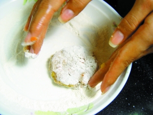 4 雙手抹上油,取適量鯪魚滑揉搓成團狀,壓成圓餅狀,雙面都沾上一層香炸粉。