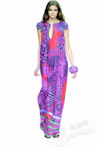 明艷的粉紅裙身上密布著斑馬紋、豹紋和各種部落圖案,傳達出強烈的異域民族風情,長及腳踝的裙身惹人眼球,同色系的超大手鐲更有畫龍點睛之感。