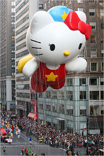 洛杉磯的小姑娘打扮成花季天使,和父母親一起參加十一月下旬的感恩節歡慶活動。感恩節連日長假,是每年美國人最重要的娛樂購物節慶之一。07年美國紐約在當地時間22日舉行了感恩節大游行,萬人參加場面熱烈。巨型卡通造型的氣球吸引了很多人?偣灿11個大氣球加入游行,其中包括在天上飄的凱蒂貓,吸引現場所有人的目光,多達800名小丑和11支樂隊,以及2000名拉拉隊員和舞者,將整個游行氣氛推向高潮。 一位紐約市民幽默的說:“我喜歡的是最后會出現的耶誕老人,因為這樣我們可以趕快離開,然后回家開始吃火雞!”