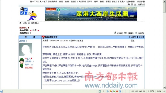 “年齡23-28歲之間,穿高幫靴,黑色上衣,身高160cm左右,黑色挎包,長發(fā),有點(diǎn)微黃。”“浩偉南飛”在帖子中寫道,他于12月1日早上8時(shí)左右乘坐204路普巴,在竹子林站拿走了這位女士的錢包,現(xiàn)在十分后悔。他說,包內(nèi)有光大銀行卡1張、工行卡2張、建行卡1張等,現(xiàn)金783元。他在網(wǎng)上留下了自己的QQ號,希望知情者與他聯(lián)系。